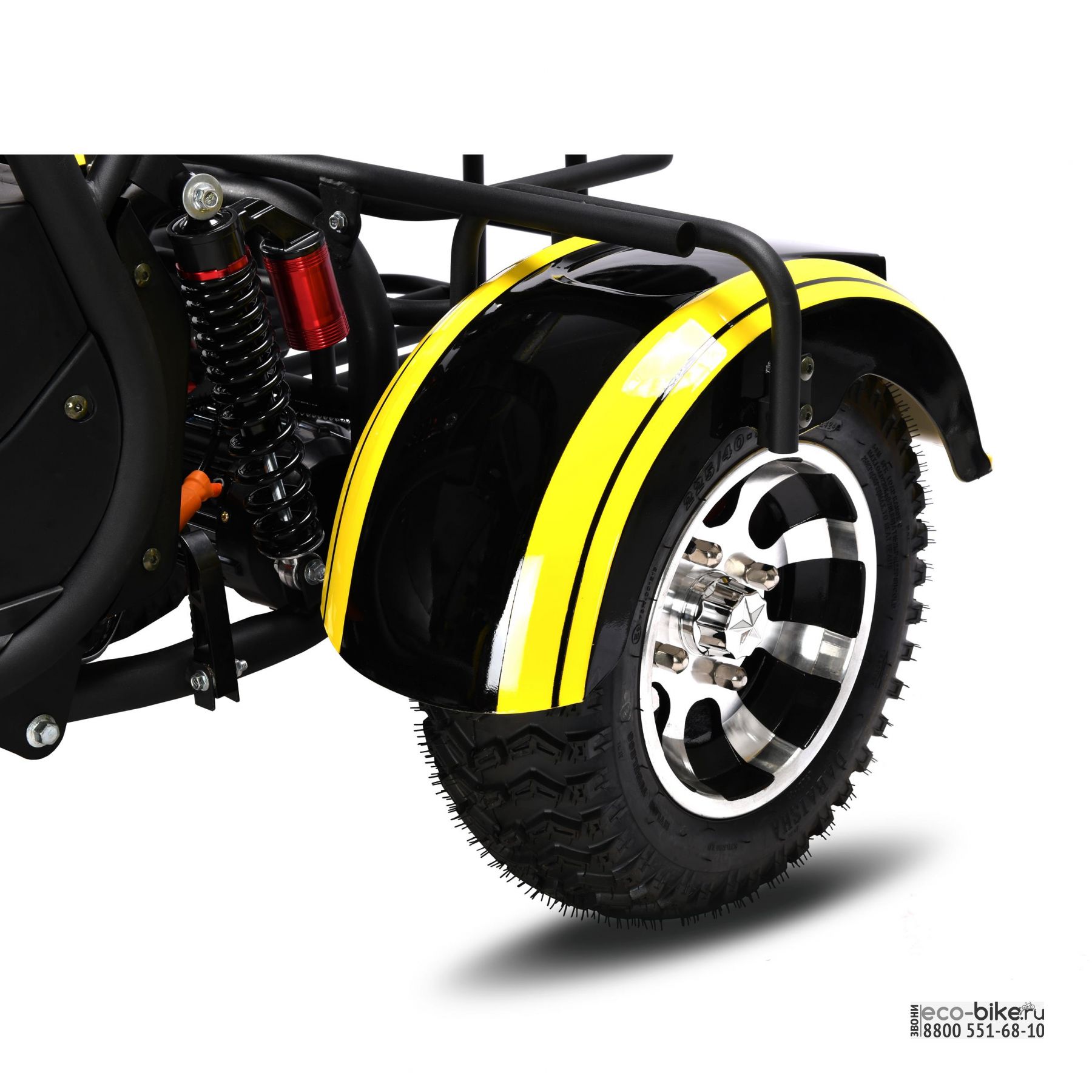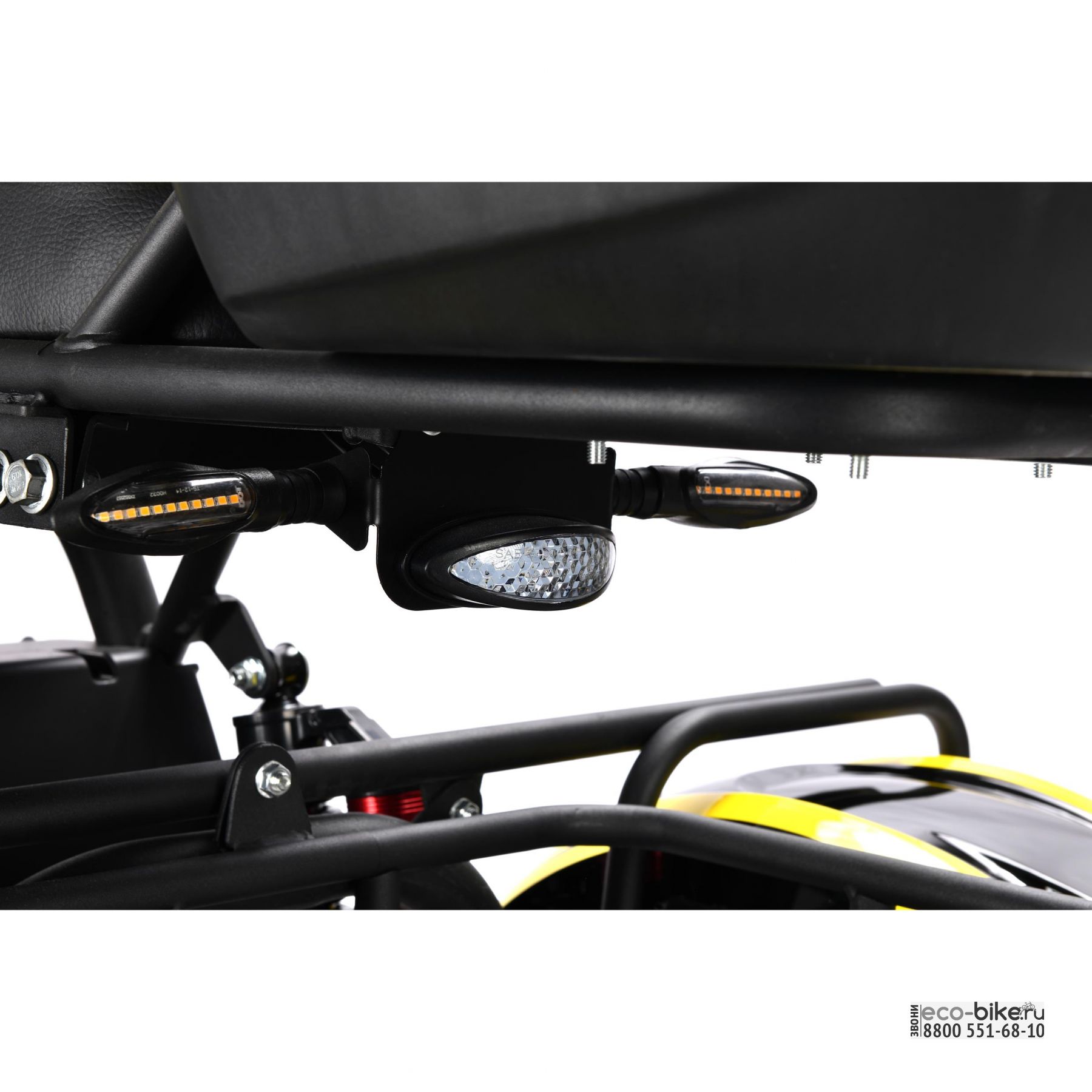 - оборудован одной мощной фарой, двумя стробоскопами, задними ходовыми огнями сертификации ECC и поворотниками с ярким свечением