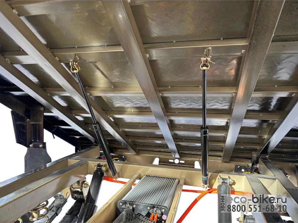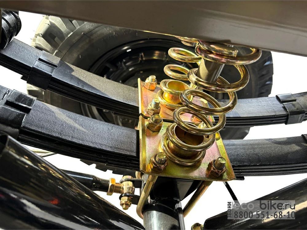 Оптимальный кузов размером 1800 × 1380 × 420 мм, усиленный вертикальными 5 рейками, откидные борта на быстросъёмных петлях с ограничителями, цельные усиленные борта из ребристого металла, двойной железный бампер, уникальные передние стробоскопы, хромированный руль с перекладиной, тормозная система с ручником, усиленный грузовой мост, двойная 5-рессорная система (10 листов) с двумя отбойниками и двумя рейками стабилизации, надёжная батарея 60V 62 А·ч и пониженная передача — всё это делает модель готовой к перевозке самых тяжёлых грузов.
